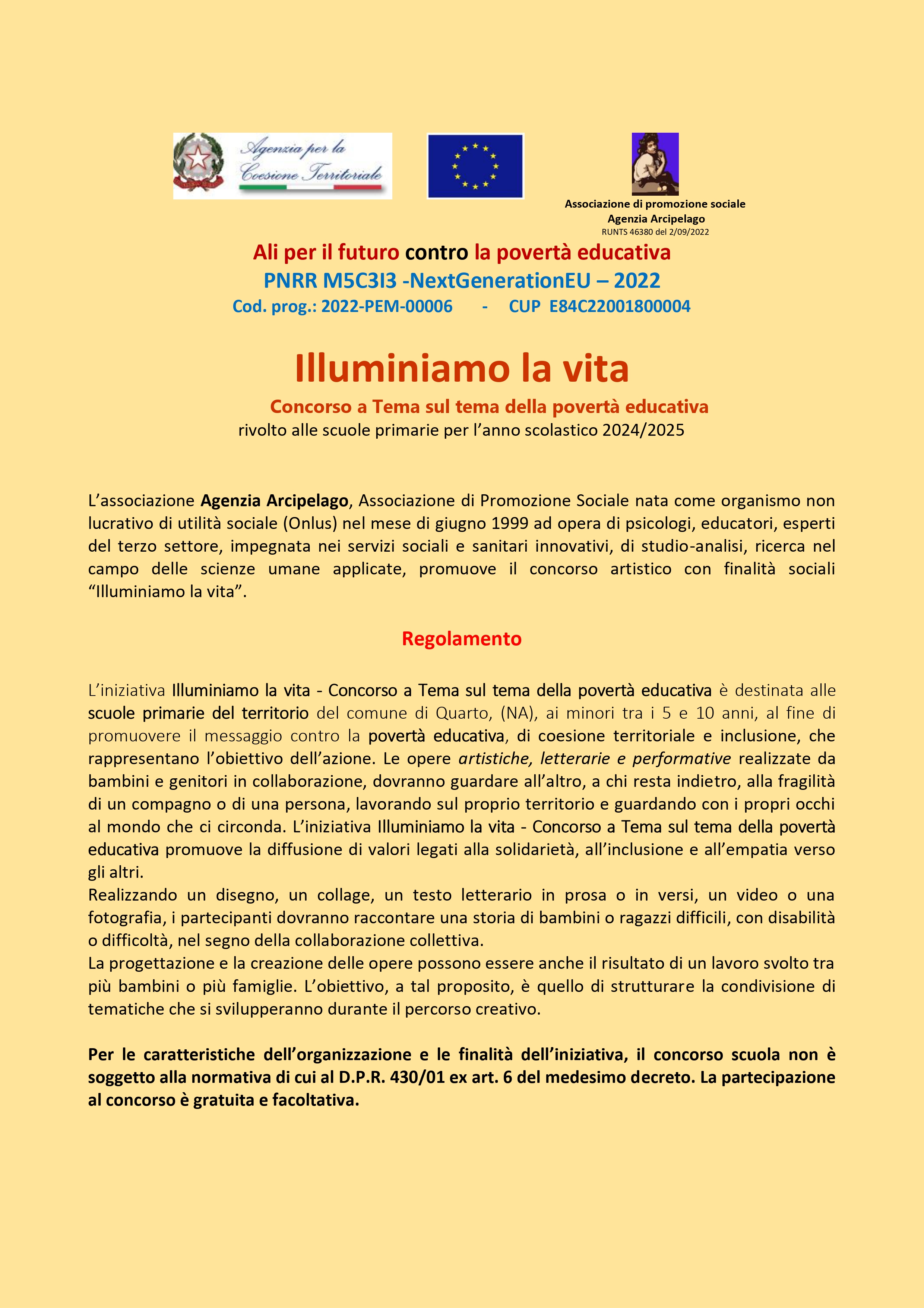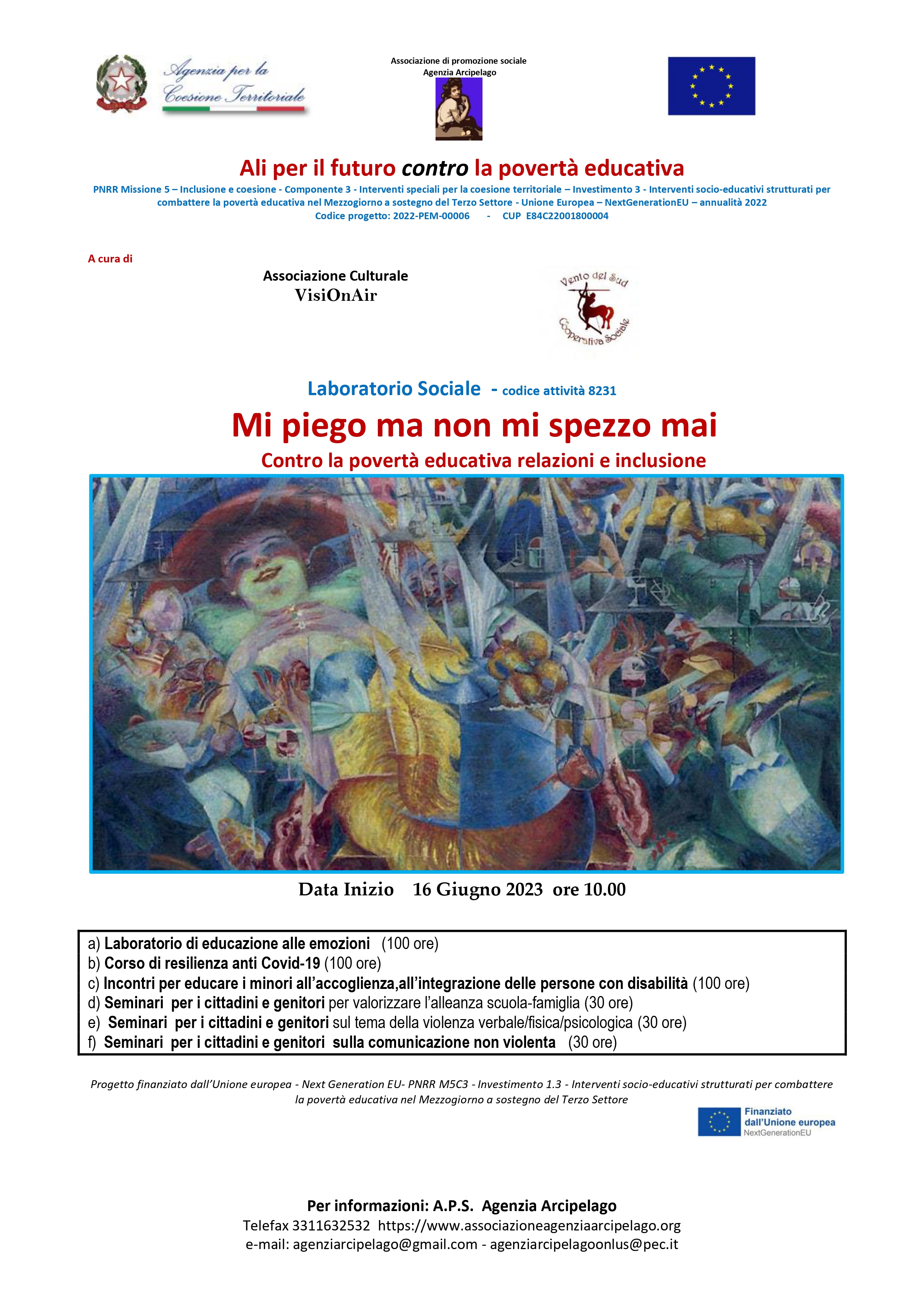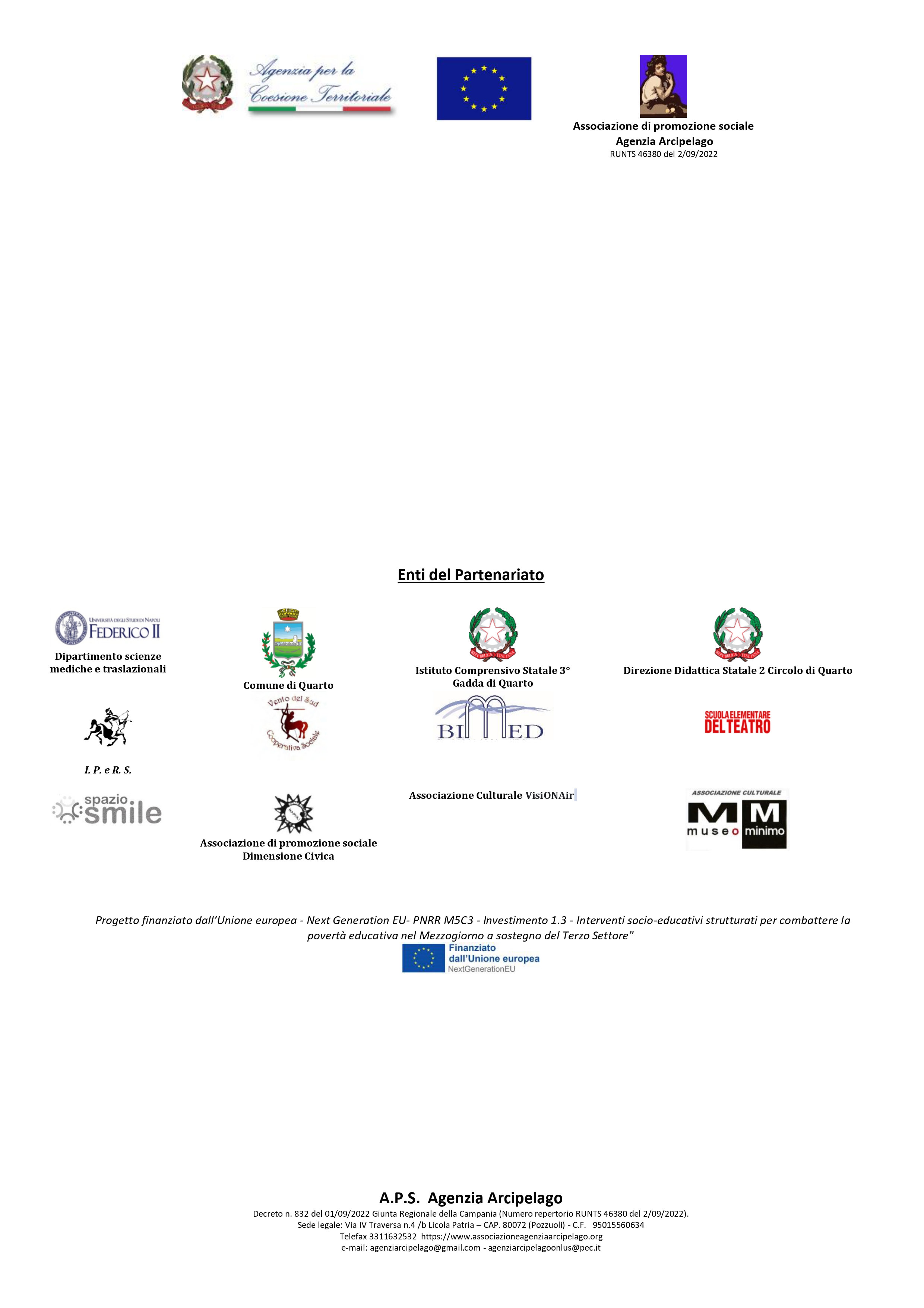 L'associazione di promozione sociale AGENZIA ARCIPELAGO garantisce un’adeguata visibilità agli interventi e trasparenza, assicura che su qualsiasi documento, sito web comunicazione riguardante il progetto finanziato sia riportato il titolo del progetto e la dicitura "Progetto finanziato dall’Unione europea Next Generation EU PNRR M 5 C 3 Investimento 1 3 Interventi socio educativi strutturati per combattere la povertà educativa nel Mezzogiorno a sostegno del Terzo Settore", l’emblema dell’Unione europea.