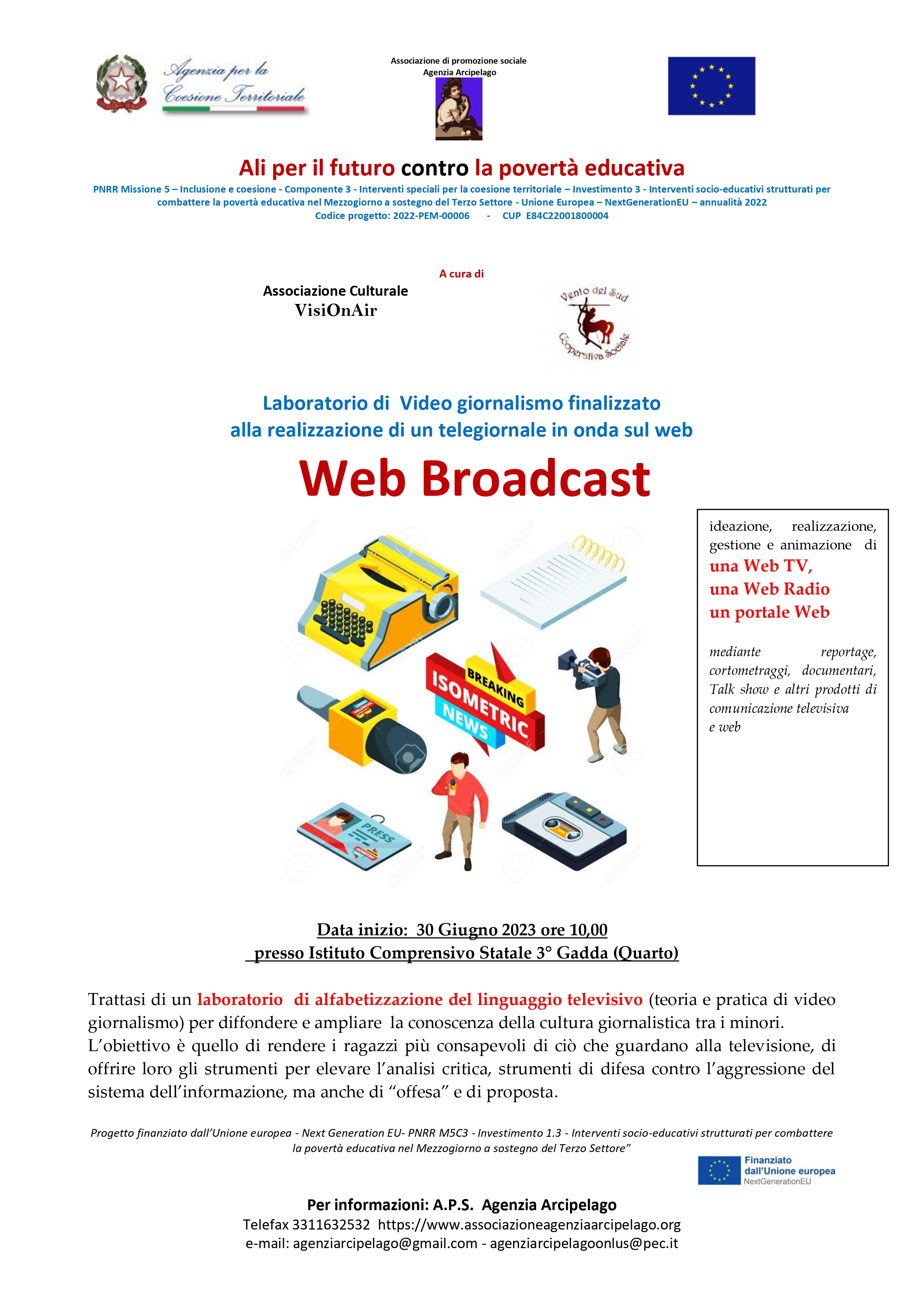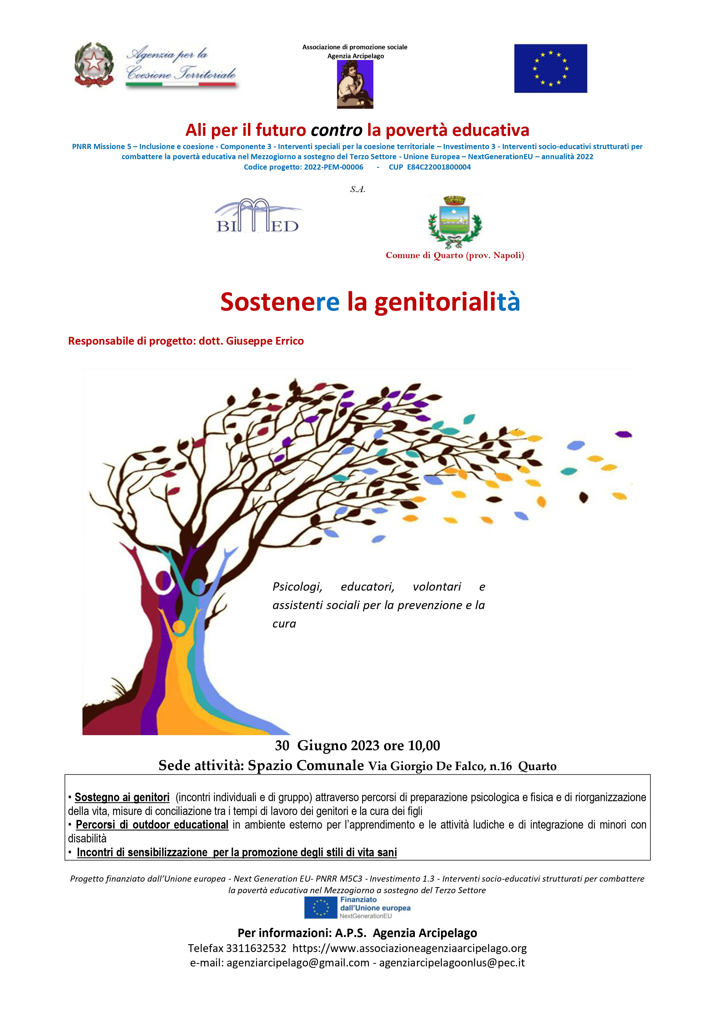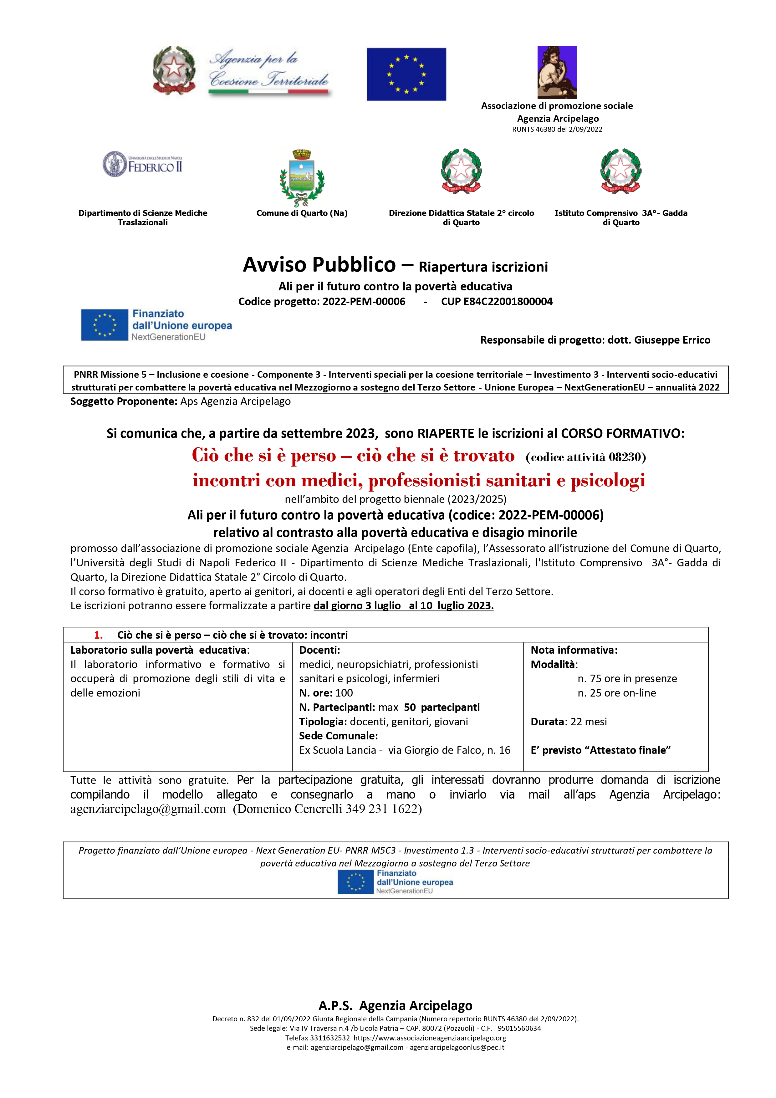 L'associazione di promozione sociale AGENZIA ARCIPELAGO garantisce un’adeguata visibilità agli interventi e trasparenza, assicura che su qualsiasi documento, sito web comunicazione riguardante il progetto finanziato sia riportato il titolo del progetto e la dicitura "Progetto finanziato dall’Unione europea Next Generation EU PNRR M 5 C 3 Investimento 1 3 Interventi socio educativi strutturati per combattere la povertà educativa nel Mezzogiorno a sostegno del Terzo Settore", l’emblema dell’Unione europea.
