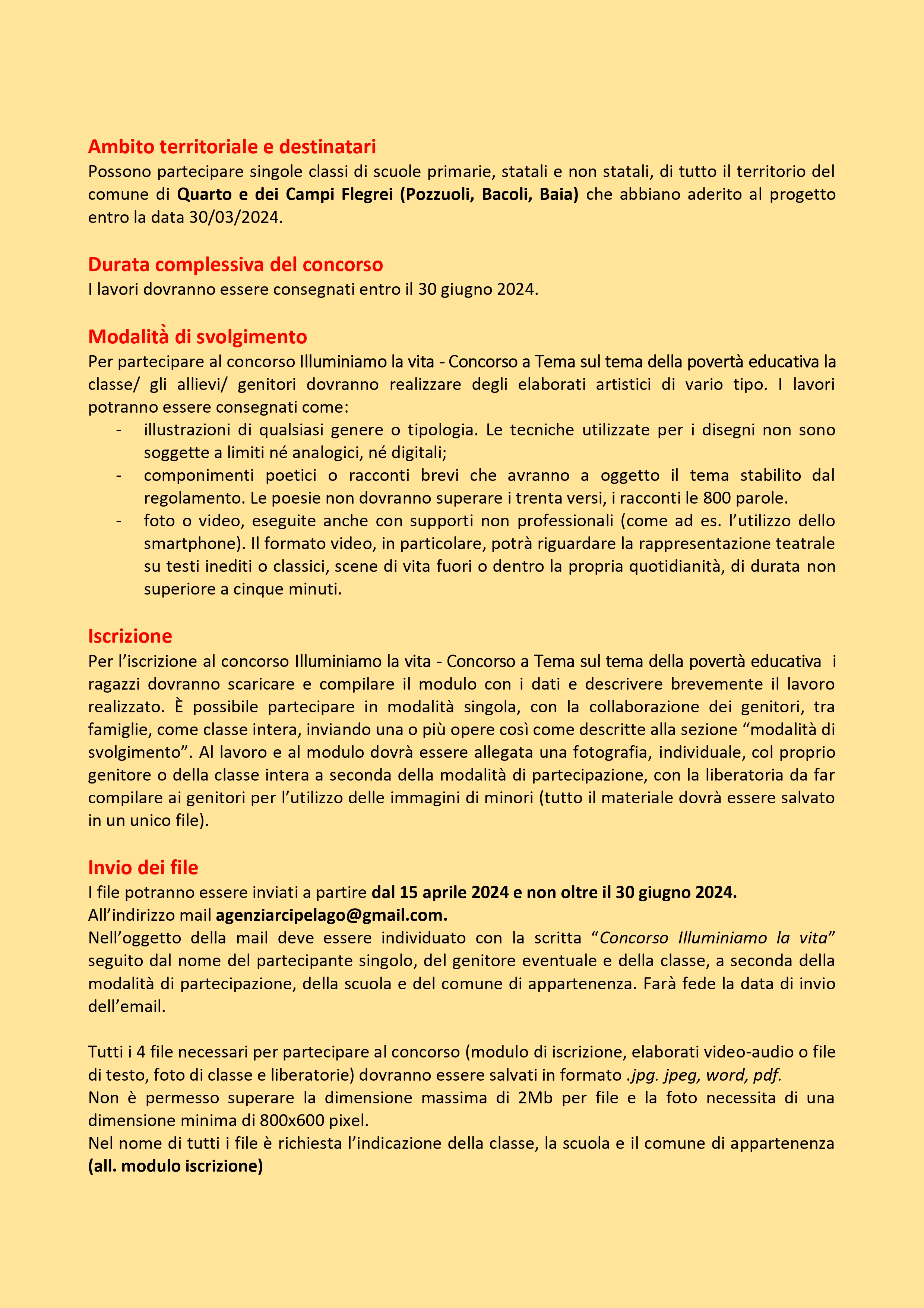 Per partecipare al concorso Illuminiamo la vita - Concorso a Tema sul tema della povertà educativa la classe/ gli allievi/ genitori dovranno realizzare degli elaborati artistici di vario tipo. I lavori potranno essere consegnati come: