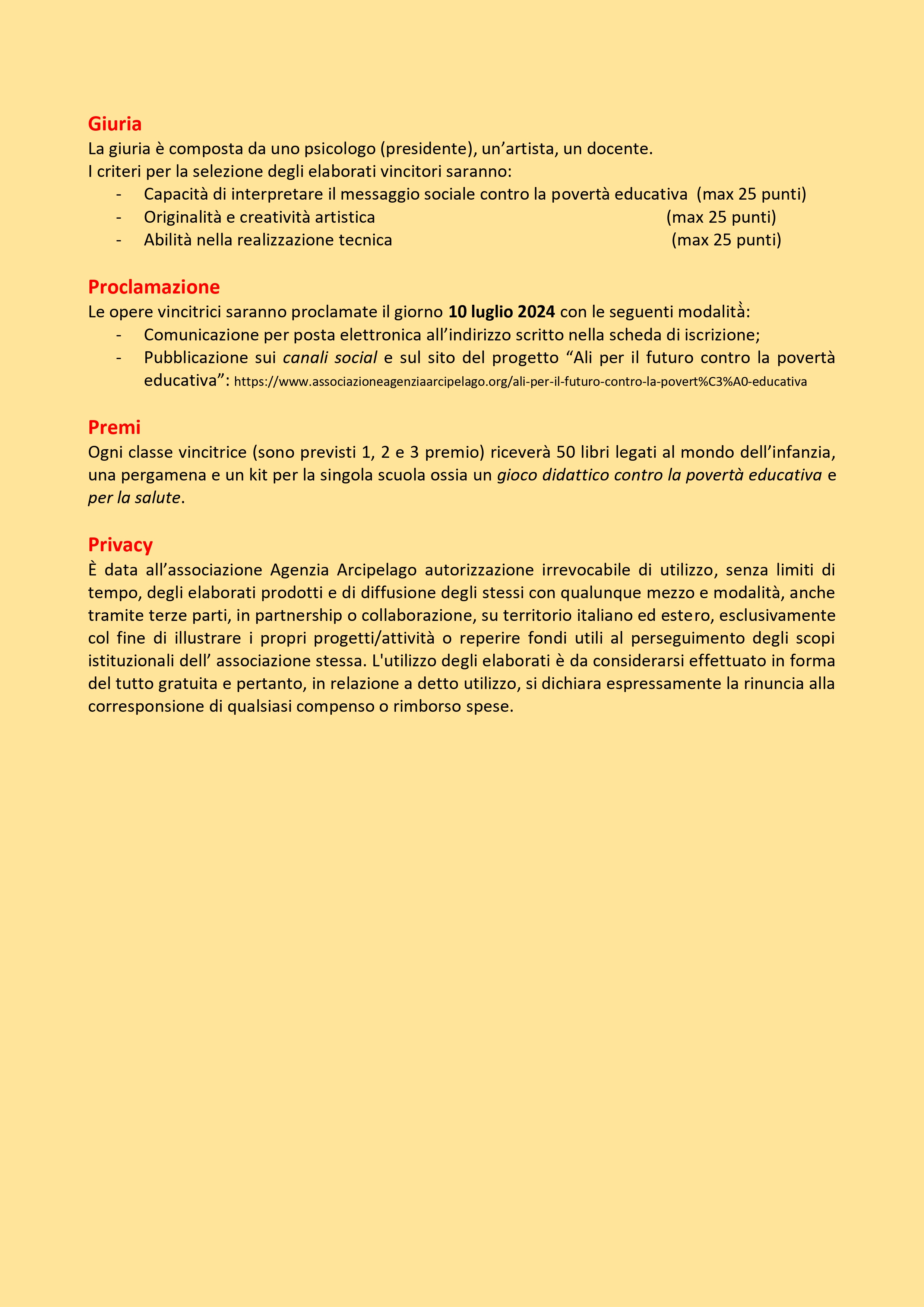 - componimenti poetici o racconti brevi che avranno a oggetto il tema stabilito dal regolamento. Le poesie non dovranno superare i trenta versi, i racconti le 800 parole.